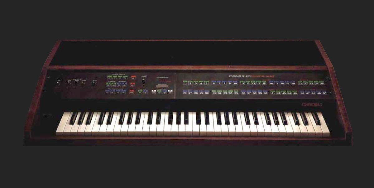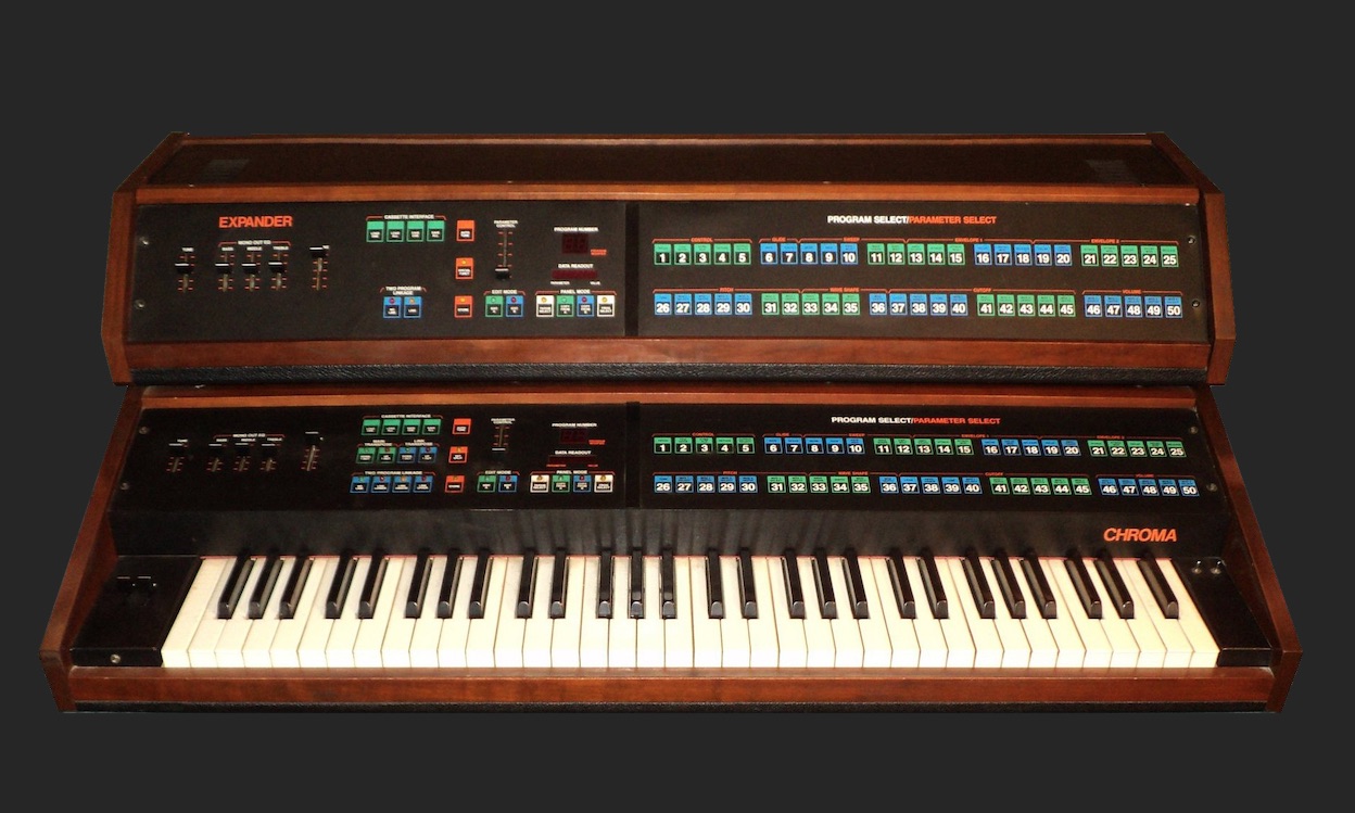 Klanglich im Bereich des Nonplusultra seiner Zeit, mit 25 pin D-sub Computerschnittstelle für Apple II (!), für den es ein Sequencer Programm gab, ein Cassetten-Interface (für Programm-Daten) und vollgestopft mit Platinen. Der Chroma war einer der ersten Mikroprozessor-gesteuerten Synthesizer. Die Hardware entsprach 16 (voll analogen) ARPs mit je einem VCO, Multimode Filter und VCA - die Basis für die überbordende Klangvielfalt. Diese 16 Stimmen, jetzt Kanäle genannt, wurden in 8 A/B Gruppierungen behandelt. Das hatte wohl - soweit ich das verstehe - mit der CV Steuerspannung zu tun, die in einem Multiplex Verfahren übertragen wurde (also quasi 2 Datenkanäle in einem Datenleiter). Die Hüllkurven (CV) wurden nämlich softwareseitig erzeugt! Die VCO hatten als "Zusatz" einen Frequenz-Sampler (mit Nulldurchgangsdetektor), der es ermöglichte, die Wellenlängen aller VCOs und VCFs zu messen (um sie korrekt im Preset zu speichern). Das ermöglichte nebenbei auch das futuristische "Auto-Tune". Bei 16 VCO und 16 Filterfrquenzen eine enorme Hilfe und deutliche Erleichterung für "Live" Situationen.