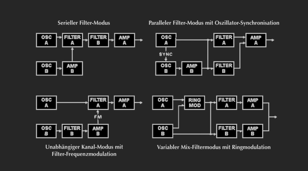 Um die verschiedenen Parameter der Module in Bewegungen zu versetzen, konnte der Mikroprozessor 32 ADSR Hüllkurven und 16 LFO erzeugen. Das sind 1x LFO und 2x ADSR pro Stimme. Die zweite Hüllkurve kam zusätzlich mit Delay - wie schon beim ARP 2500. Die Stimmen konnten auch paarweise arbeiten. Die Grafik zeigt 4 von 16 möglichen Verschaltungen der Kanäle, wenn Kanal A und B der Paare verknüpft wurden. Der Chroma war dann natürlich "nur" noch 8 stimmig polyphon, die Sounds aber deutlich fetter oder komplexer. Weitere Ideen aus dem ARP 2500: die Farbcodierung der Membran-Knöpfe und jetzt ein Mikroprozessor (der die CV Verbindungen herstellt) anstelle der Matrix-Slider - anstelle der Patch-Kabel.