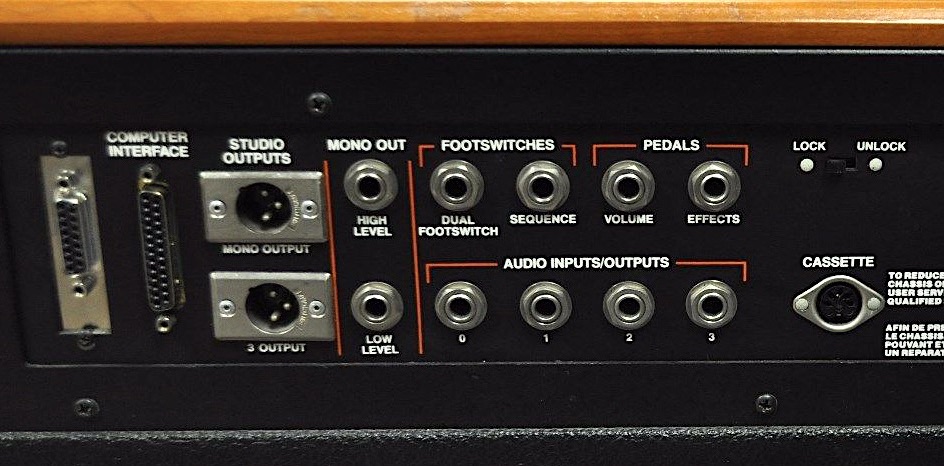 Auch die Rückseite des Chroma war ziemlich eindrucksvoll und es gab einige neue Buchsen. Ganz links ist ein (silberner) kleiner 15-poliger D-Sub Eingang, der nicht standardmässig dabei war. Der Synth kam vorbereitet, aber mit leerem Mini Panel als Abdeckung. Ich hatte diesen Stecker bekommen, um mein EES MIDI-Interface anzuschliessen. Daneben der grosse 25-polige D-Sub Stecker ist für die Verbindung mit dem Apple II Computer. Dann zweimal XLR "Studio Output" (symmetrisch) und daneben die "klassischen ARP Audioausgänge "Low- und High Level" (für Bühnen-Combos als Klinke). Das "Dual Footswitch" Pedal war sehr gut, denn es rutschte nicht weg, weil man mit dem Fuss auf dem Bodenblech stand. Es war deshalb riesig - genauso tief, wie der Chroma (siehe Case-Foto). Mit dem Squence Switch habe ich keine Erfahrungen, aber die Eingänge für Volume- und Eypression-Pedal waren hochwillkommen! Bei den "Audio Inputs/Outputs" war Default-mässig der Output 3 (die Nummer hat auch der 2. XLR Out) als rechter Output für Stereo gedacht, man konnte das aber auf 1,2 oder 3 ändern. 1-3 waren Inputs. Wollte man den Chroma in Stereo spielen, musste das aber vorher definiert werden (Link-Channel). Das Casseten-Interface, um Soundbänke zu speichern oder zu laden, war State of the Art. Es klang wie bei einem der ersten Modems und beim Laden auf der Bühne war es durchaus stressig, denn manchmal brauchte es mehrere Versuche, bis der Inhalt fehlerfrei übertragen wurde.
