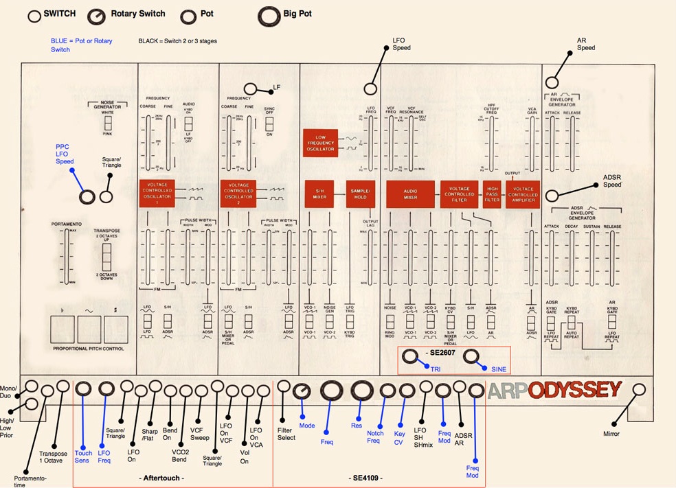 Beim Odyssey begegnen wir zwei technischen Ideen aus dem ARP 2500 wieder, die im ARP 2600 fehlten: die Farb-Codierung und Switches, die Patchkabel ersetzen. Ihre Positionierung in einer Reihe zwischen Tastatur und Sliders machen die möglichen Schaltungen übersichtlich und sehr schnell ausführbar.