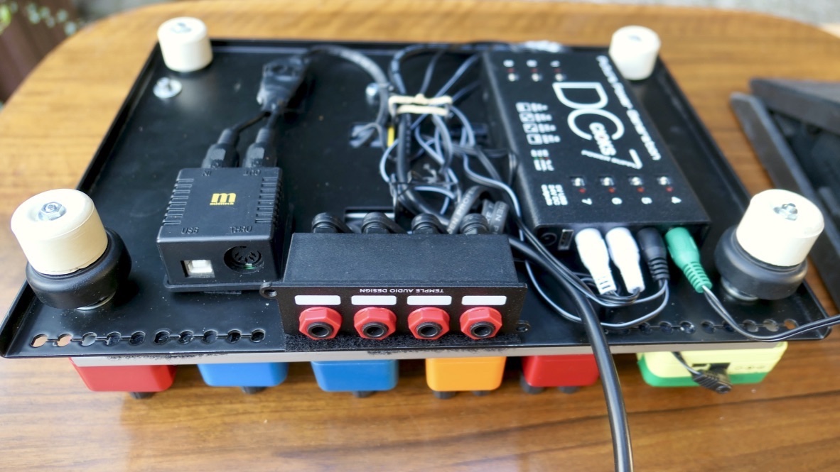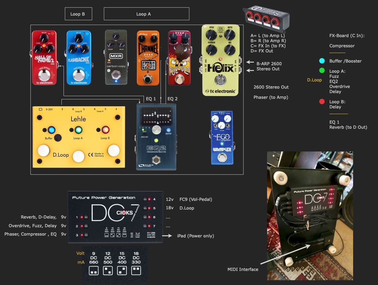 Rechts ist der Zustand der aktuellen Umgestaltung zu sehen. Die Basis ist ein ausgedienter "Laptop-Halter" (36 x 24 cm) von einem Keyboard-Tisch. Ich habe ein paar Löcher hineingebohrt, um die Füsse, den Lehle D.Loop und das CIOKS DC7 zu verschrauben. Sollte etwas mal nicht funktionieren, wird der erste Griff sein, das Board an der rechten Seite anzuheben und zu schauen, ob alle Kontrollleuchten korrekt leuchten.