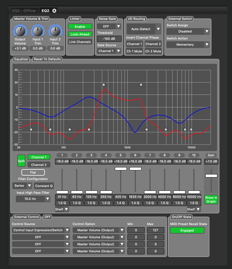 Dieser EQ ist wirklich spektakulär! Er ist in Stereo ausgelegt, die beiden Kurven können aber auch parallel oder in Serie benutzt werden. Mit ±18 dB (auf jedem Band kann er etwas mehr zupacken, als man es erwartet. Er hat einen Switch-, bzw. Pedal-Anschluss, vereinigt die Übersichtlichkeit eines grafischen- mit den Vorzügen eines parametrischen EQ - inkl. variabler Resonanz! Auch die EQ-Band-Frequenzen für die Slider lassen sich, wie Q Factor, frei bestimmen oder über Pedal oder MIDI bewegen. Zusätzlich sind Noise Gate, Limiter, ein zusätzlicher regelbarer +12 dB Clean Boost und sogar ein Stimmgerät im EQ2. Der EQ2 hat vier Preset Buttons, hat aber über MIDI oder USB 128 Presets. Über USB lässt sich ein Editor anschliessen (Mac, Windows, iOs und Android) und es gibt - sehr lehrreich - Presets zum Download. Meine Aufzählung ist unvollständig - der EQ2 ist wirklich eindrucksvoll!