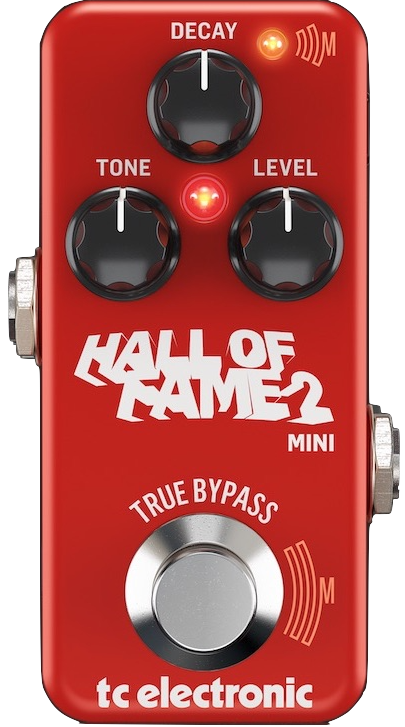 Inzwischen habe ich das Nachfolge-Modell "Hall Of Fame 2" (Bild). Das HOF mkII ist deutlich besser, schon allein, weil es statt einem nun drei Regler hat. Die neue "Mash"-Funktion der neuen TC Generation nutze ich allerdings nicht: einen ganzen Arm aus dem Verkehr zu ziehen, um einen Knopf für einen bestimmten Effekt zu drücken, das wäre zuviel - ich bediene die Teile ja nicht mit dem Fuss... Die drei Regler "Decay", "Tone" und "Level" waren ausschlaggebend für den Kauf - und die Ablösung des alten "HOF".