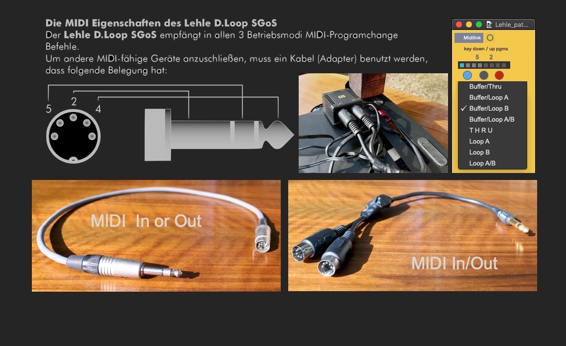 Da das, von Lehle gebaute MIDI-Kabel (links im Bild) mit meinem D.Loop mitkam (Gebrauchtkauf) und D.Loop sowohl Program Change empfängt, als auch sendet - je nachdem, ob der (DIN) MIDI Stecker in einer In- oder Out-MIDI-Buchse steckt - und weil ich mir mit Max die MIDI-Vorgänge genau ansehen kann, habe ich mir ein TRS-Klinke zu 2x MIDI gebaut. Dazu sind die drei benötigten Adern beider DIN-Stecker einfach zusammengelegt, also identisch. Zusammen mit dem MidiLink Mini-Interface funktioniert es - ich habe aber auch ein billiges USB zu MIDI Interface Kabel, mit dem es nicht geht. Mit dem MidiLink kann ich sowohl die drei Switches am D.Loop drücken und Max empfängt die aktuelle Position, oder, ich kann von Max aus alle acht möglichen Positionen des D.Loop aufrufen.