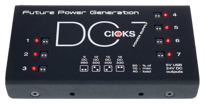 Mit Ausnahme des D.Loop, der mit 18V läuft, könnten alle Effektpedale auf dem Board an einem DC 7 Ausgang betrieben werden! Sie sind nur wegen der vorhandenen Kabel und dem begrenzeten Strombedarf so "grosszügig" angeschlossen - es lässt sich also wesentlich mehr anschliessen. Die 9V Geräte brauchen zusammen nur 538 mA (3x TC = 4 x 100 mA, 2x Zvex, 10 und 15 mA, Carbon Copy 26 mA, Wampler 22mA und der EQ2 165 mA) von den 660 mA am 9V Ausgang des CIOKS DC7. Das Volumen-Pedal braucht 12V - aber nur 5 von den 500 mA mit 12V. Der einzige Ausgang, der mit über 50% belastet ist, ist der 18V Ausgang - der D.Loop braucht 195 von den verfügbaren 330 mA.