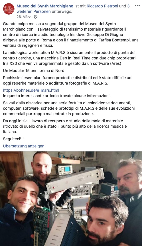 In the meantime, the 'Museo del Synth Marchigiano', at their annual event, in October 2021, has made M.A.R.S. and IRIS the main topic and has not only presented concerts with the M.A.R.S., but also lectures of some developers of the M.A.R.S.. For this purpose, contact was made with Peppino Di Giugno, Sylviane Sapir, Paolo Andrenacci and others, who not only spoke but also answered questions in Marchigiano. This is really gratifying!