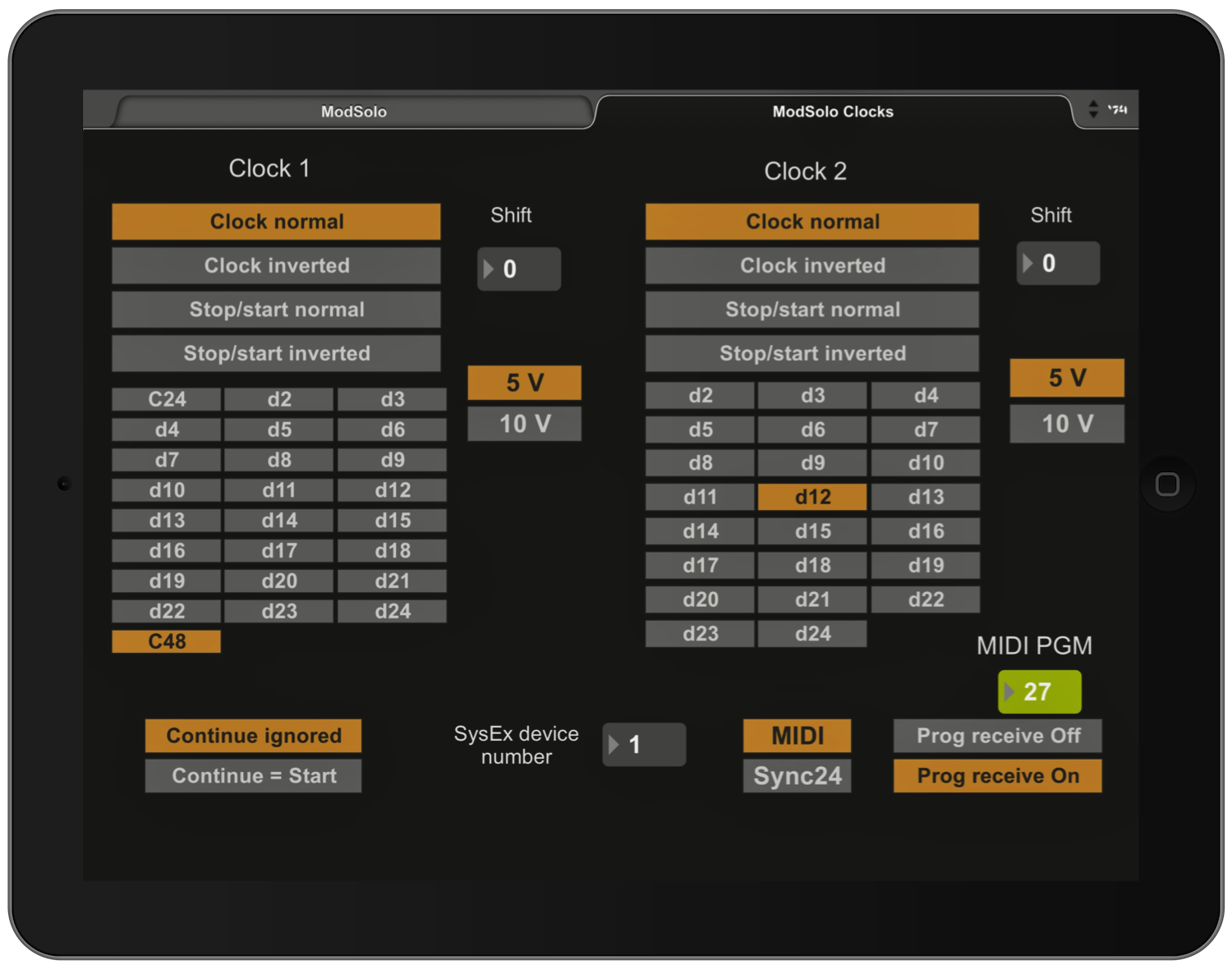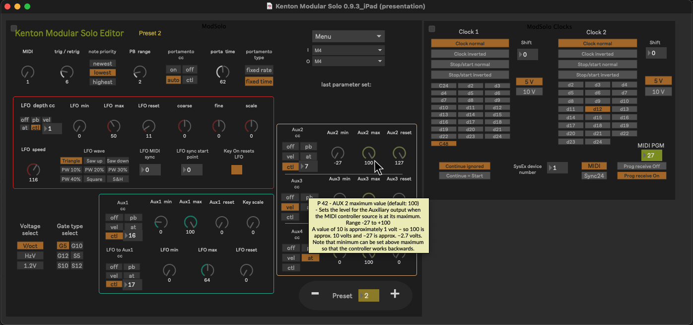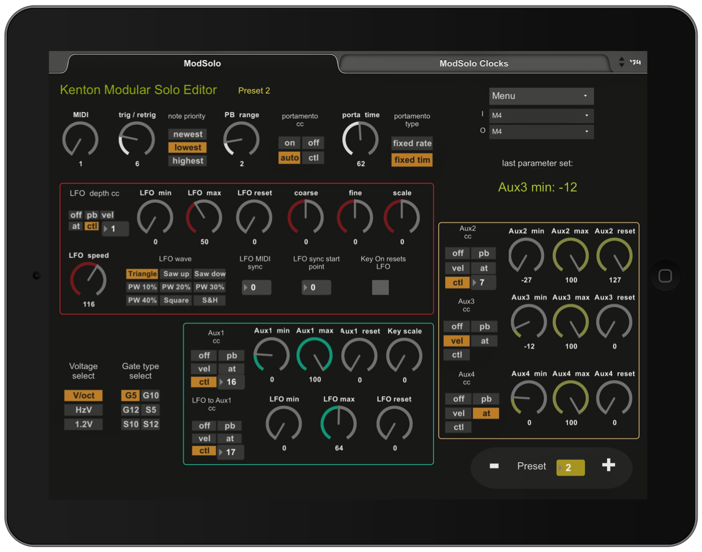 Using the Editor on an iPad (with the MIRA app) is unbeatable - a real pleasure! I placed the clocks of the Kenton Modular Solo (and a few system settings) in a second TAB. No other controller can do it like this.