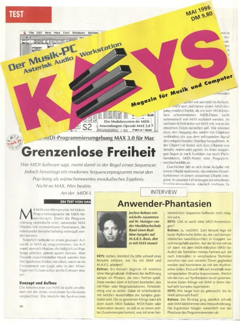 Five years later, MAX still was very exotic for most people, but Computers were popularizing - and "the more creative" musicians mostly had Apple computers. By now it was obvious that computers would play the central role in the future of Electronic Music. Meanwhile, through my connection to the "Electronic Studio of the Music Academy Basel", I had a real-time DSP system, M.A.R.S., which was still far ahead of its time that I operated using MAX. Another unmistakable sign for the continued existence of MAX was the fact that I was invited for an interview by the "KEYS" magazine when the MAX 3.0 test report was published. This magazine represented a completely different direction and was rather a "main street magazine". In universities, MAX already had evolved into the standard and the live electronics were typically controlled using MAX patches.