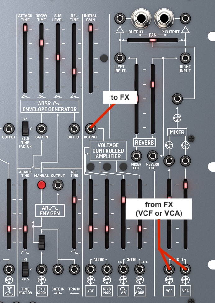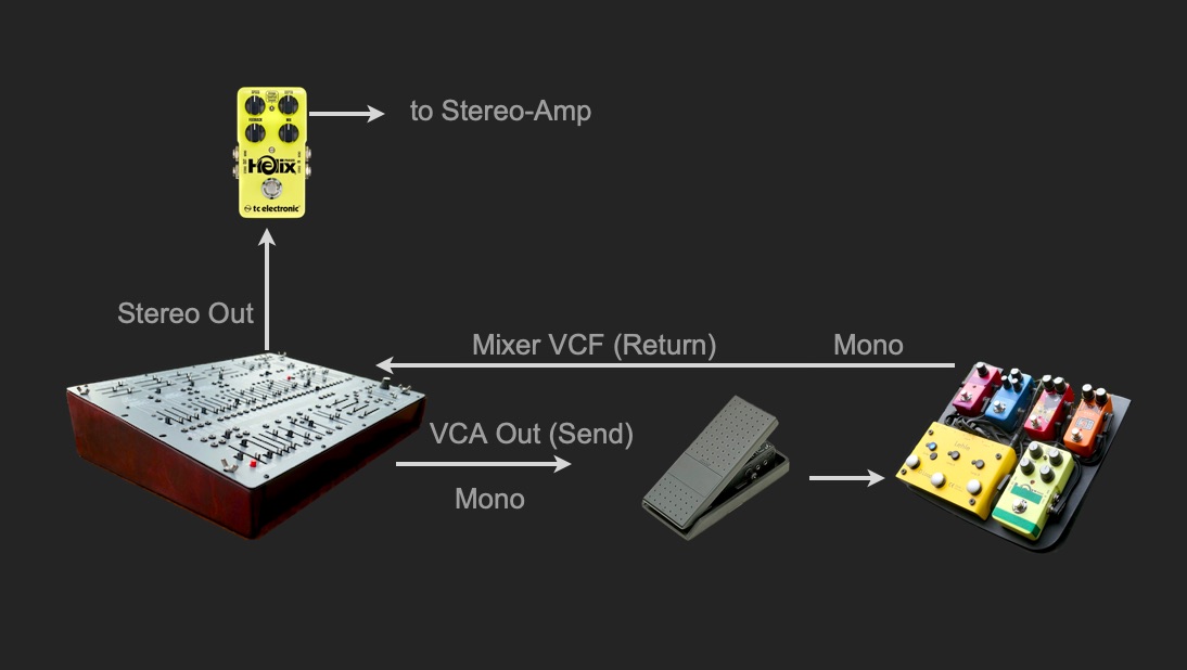 In the imgage, the Input and Output is marked. The label "FX" (Effects) already indicates the direction in which it proceeds: Here I do not only have a Volume Pedal, but the pedal also passes my (mono-) Pedalboard before it is returned. In the picture, both channels are marked with "from FX", but there is only one channel coming back. I actually always use the left input (VCF), because 1. I provide the VCF attenuation with the pedal and because 2. the right (VCA) channel becomes the "dry" channel. If the Volume Pedal is opened and the FX pedals are set to bypass, the normal circuit of the 2600 is restored.