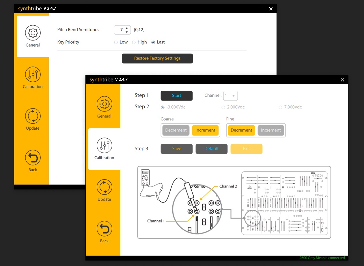 The second tab of the software is also interesting: here the calibration for the second voice (upper voice) seems to be done. I will have a closer look at it when I get an opportunity. First I did some MIDI performance tests: there have been no note hangups and also no other issues, everything worked fine. The pitch bend operates in a clean manner - and the 14 bit resolution makes it great for microtuning! Also the ARP Little Brother connected to the "KYBD CV" was tracked exactly identical - also with inverted CV.