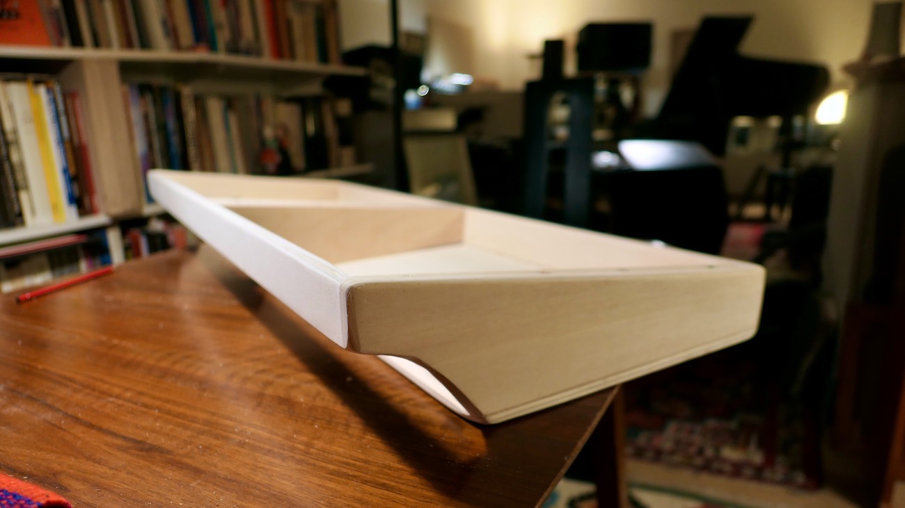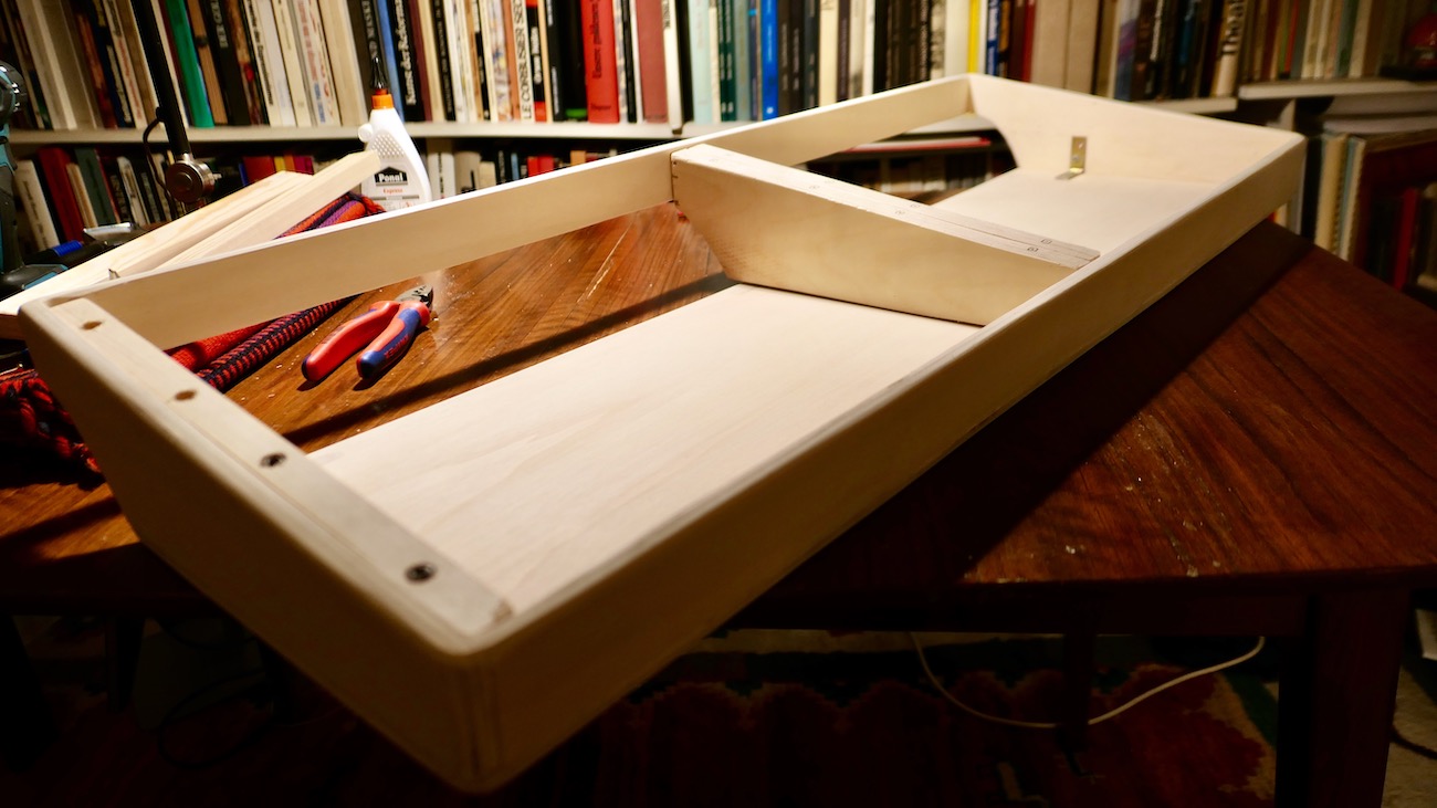 I paid 10 Euros for the (thin) poplar wood (sides and bottom) at the hardware store. The thicker support woods inside were scraps I still had in my workshop... The brass angle, which can be seen in the image, was bolted in only during the gluing (as an aid). After the glue dried, I took it out again.