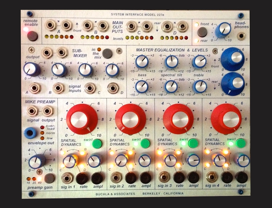 The sole module of the current "200e Series" in my instrument is the "System Interface 227e". However, mine is optically adapted to the historical "200 Series" (Rogan pot caps). I preferred the current 227e module to the historical 227 because its only half the size and much easier to get. It also tends to fit even better with current digital equipment. The 227e features a mic pre with envelope follower, a headphone amp, a 4 in 1 submixer and 4 inputs and outputs. Each output can be levelled separately and has its own "swirl" generator for 4-channel rotations (direction/rate/amplitude). Output 1+2 and 3+4 each have a 3 band equalizer and master volume. Four meters with 6 LEDs each show the output levels. Although the mixer outputs could be replaced quite easily with a MAX patch, the additional functions (mic-pre, submixer, headphones) might be badly missed. The EQ's prior to the outputs are also welcome.