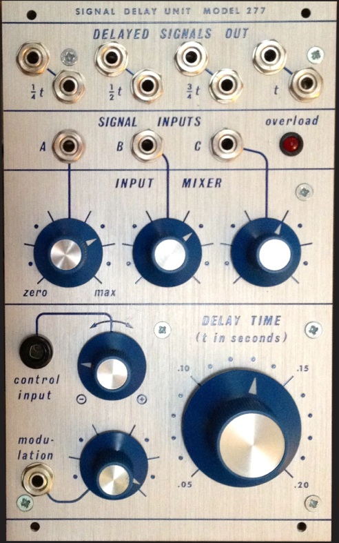 I had the "Signal Delay Unit Model 277" in my instrument only for a short time. This delay is another special module, because it has never been produced by Buchla. If I am informed correctly, it was developed by Roman Filipov (Sputnik)! The 1/4, 1/2 and 3/4 outputs are there to add feedback.