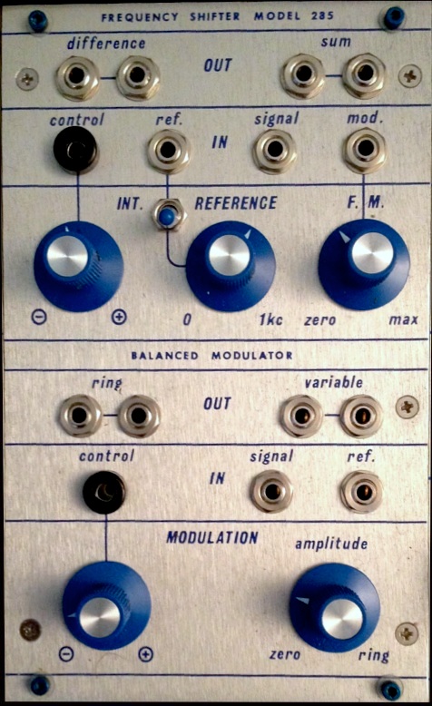 The Model 285 is Frequency Shifter and Ring Modulator. This combination is obvious because for Shifting the waveform is halved and only the positve values are heard. By increasing the offset-voltage the pitch raises (Shift). By connecting the negative wave component, the "counter-oscillation" comes into play and the Ring Modulation effect is generated. I call it effect, because it does not quite correspond to a "typical" Ring Modulation - it remains more to Ring-Mixer.