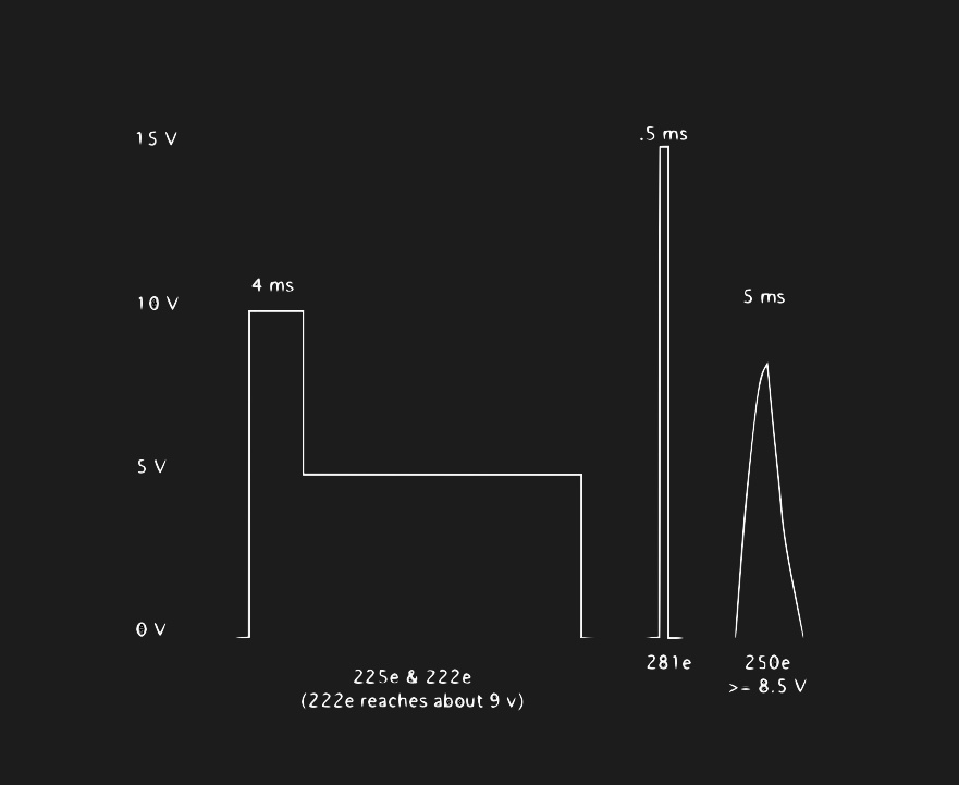 Buchla has very different pulses in different modules. In the graphics of Chris Muir this becomes evident. The key problem is that the Gates/Trigger/Pulses are not supposed to be longer than 4ms. The pulse of the "Function Generator 281" is even only 0.5 ms short. The second issue is that the typical Buchla " Stepped Pulse" consists of a >8.5V Trigger and a 5V Gate.