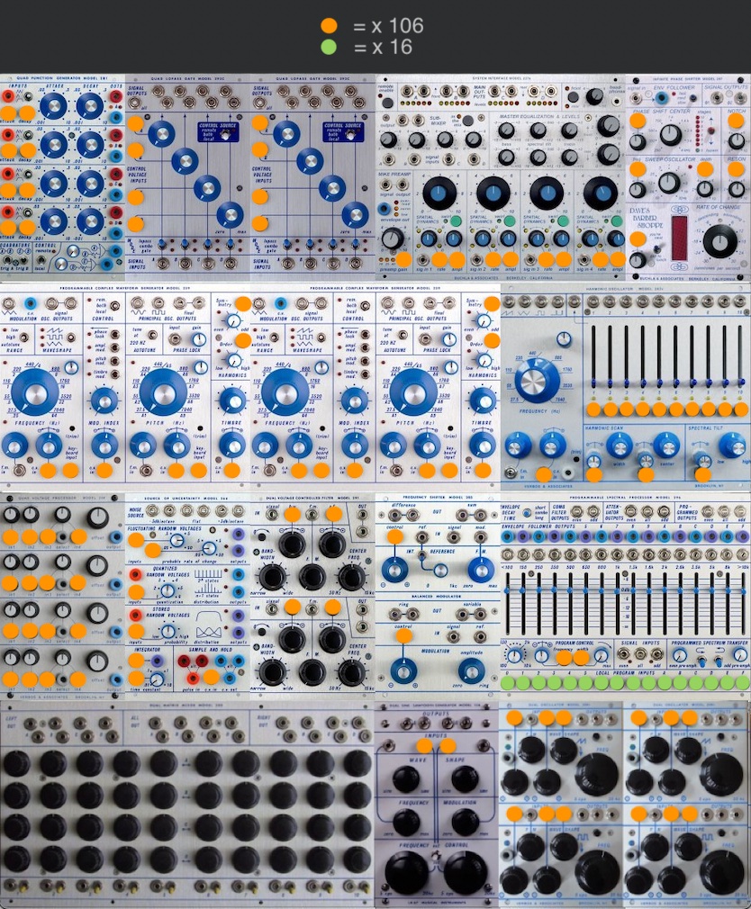 On the picture the top row shows the modules that are in the Buchla (including the ones on the rear side):