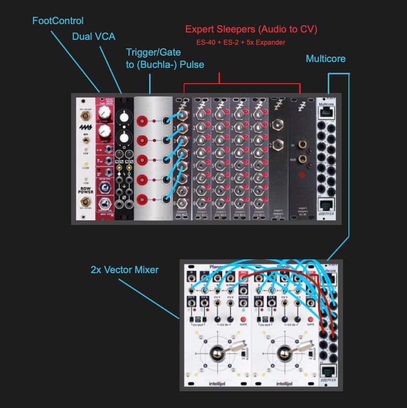 The two Planar Vektor Mixer modules (with Joystick) I keep in a mini case in front of the Buchla. The 2x 4 audio inputs are sent via a Doepfer "Multicore" set to the Planar modules. All 8 channels are sent via Ethernet cable. The alternative would be quite a cable chaos with 8 long cables crisscrossing the instrument. The two mono mix outs of the Planar modules return via another Ethernet cable - into a dual VCA, which I use to control the volume of the mix outputs.