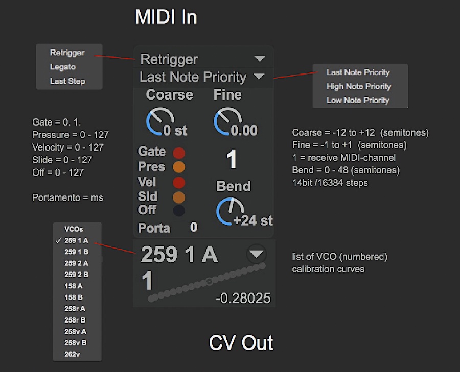 The MIDI data generated here will be combined and "housed" in a stereo audio signal, which will be sent as SPDIF (digital) to the Expert Sleepers ES 40 module, and there again separated and routed to one of the 40 CV (or gate) outputs.