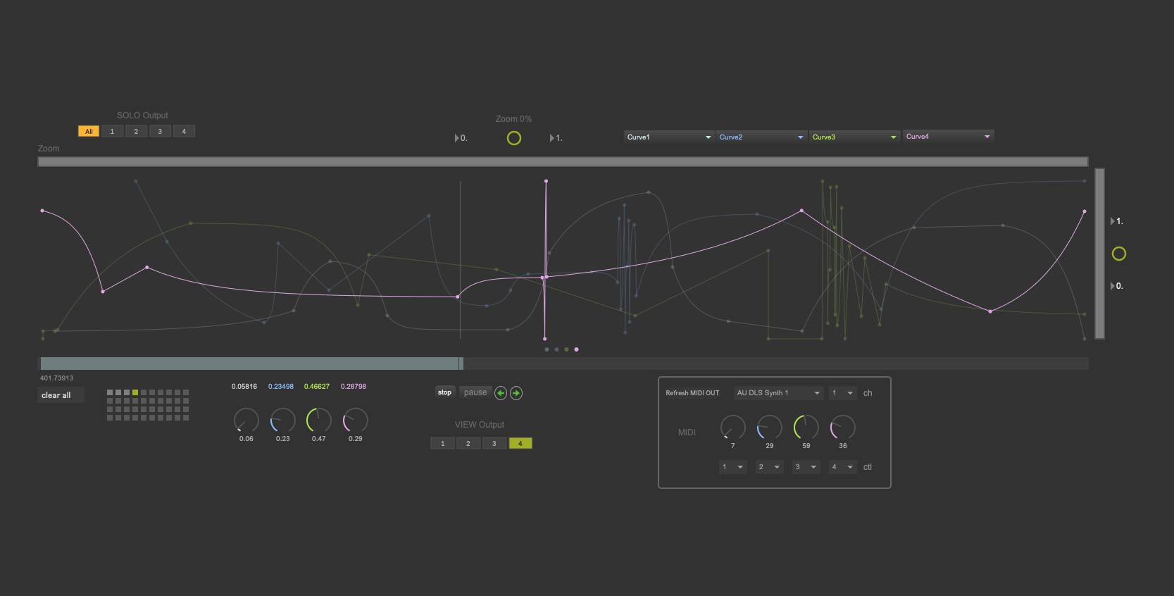 Progression curves can also be implemented very well. Shown here are 4 curves that run simultaneously from the beginning to the end (or vice versa) within a desired time period. Instead of the automated progression, a slider can also be used for positioning. The lower gray bar shows the current position.
