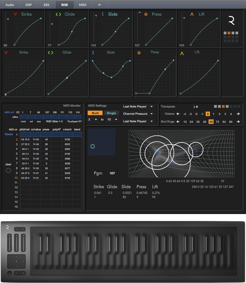 At this point I feel it would be useful to briefly mention the controller data. The key for the playability of the hybrid modular synth are the controllers. Shown here is the panel for the RISE keyboard, which I programmed myself (as a tab). This is where all the sections, separated from each other, can be set and all incoming and outgoing data can be viewed. The 5 curves are for setting the "5 Dimensions" of the Roli Rise and I have set myself 5 more curves for adjusting the curves to my playing manner (velocities etc.). Easily recognizable is the curve under "Press", which shifts the onset of the pressure curve a bit backwards, so only at more significant pressure begins to read out the upper curve. This way I don't have pressure (aftertouch) data all the time and with each remaining touch, but only when I really want it. And of course I can save different curves as presets in MAX. I am thrilled with the RISE Keyboard. To me it is ideal for playing synths, since I don't want to play the modular synth like a pianist.