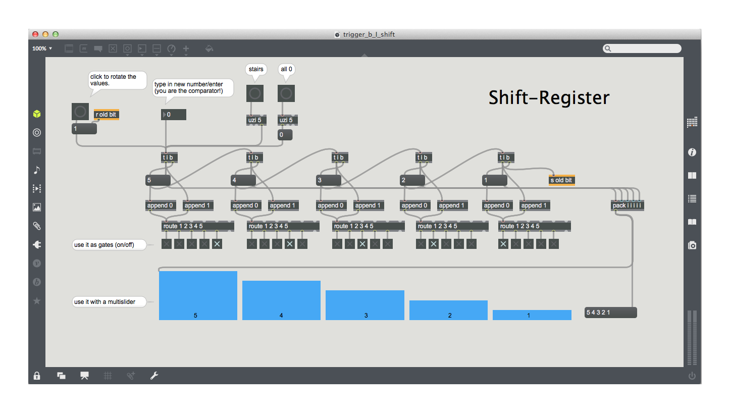 Ein Shift-A Shift Register passes the value of the first digit to the second digit, to the third, etc., as soon as the input value changes. This can be implemented in MAX, for example, as follows: