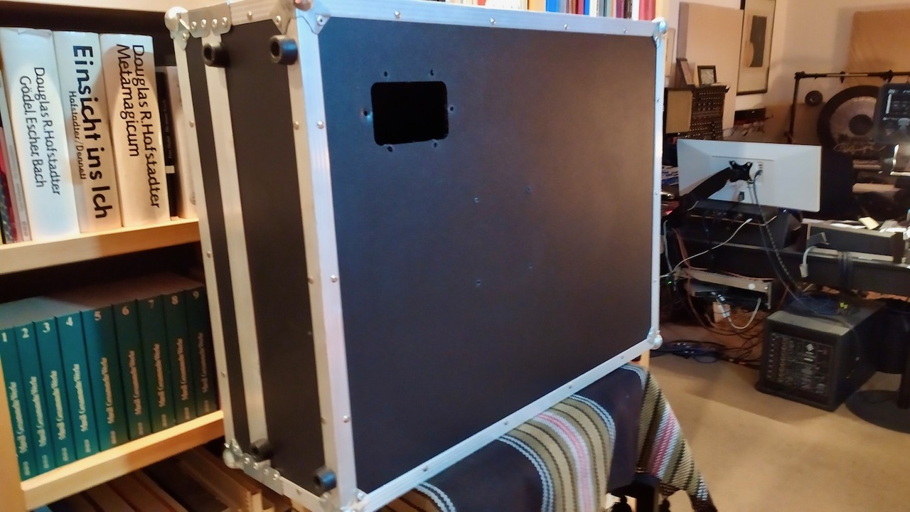 19-inch case with 15U, which I had custom- built for my 5U MOTM Modular. At around 5 kg, it is pleasantly light and very well suited for transporting a modular synthesizer. It has eight rubber feet: four for transport (horizontal), two on the lid and two on the case, and four on the case for instrumental use (vertical, without lid). The case is 14 cm deep and the lid is 7 cm deep, which is deep enough to transport 5U modules with 6.3 mm jack patch cables in a patched state.