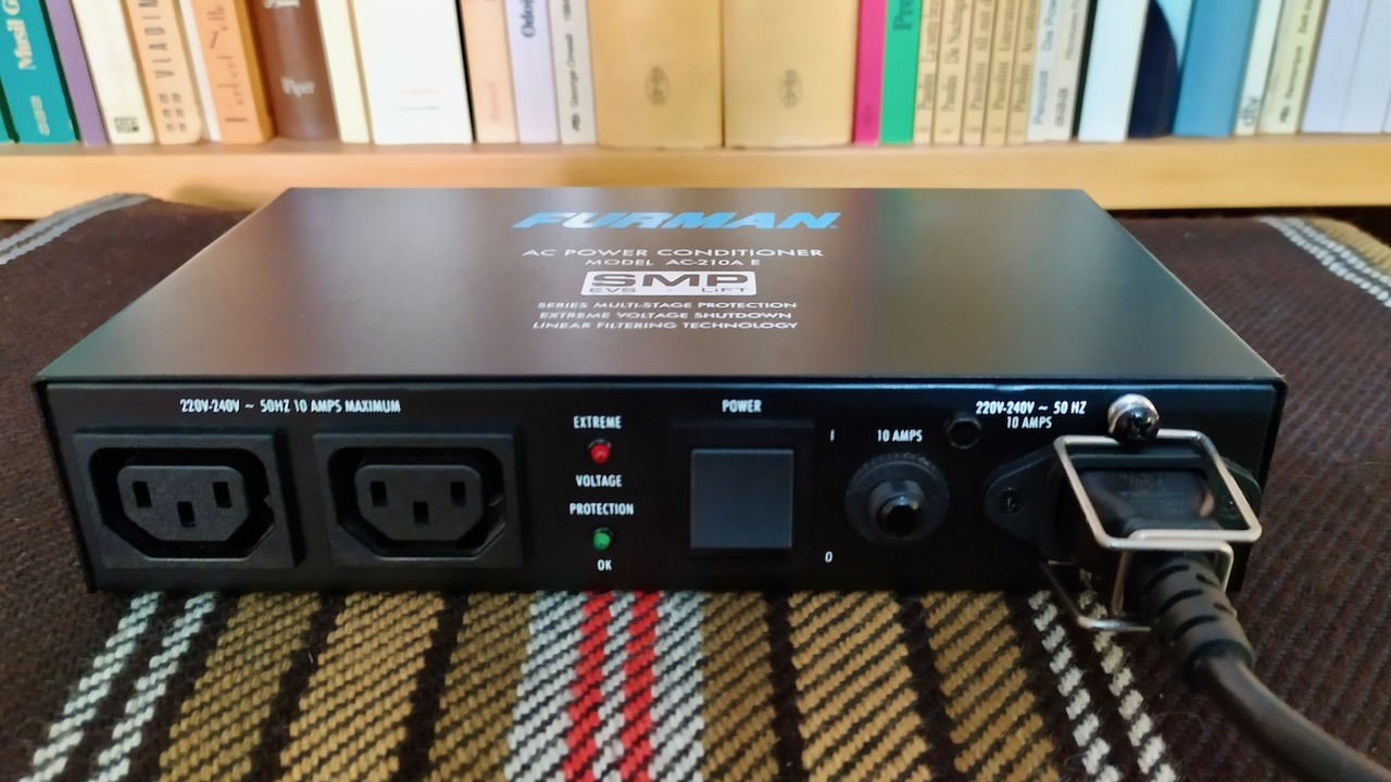 Lovely little power conditioner from leading manufacturer Furman. Although it only has two connections, it can “clean” a total of 10A. This means that multiple sockets can also be connected (add up the power requirements of the connected devices beforehand!). In addition to conditioning, it also offers reliable overload protection without destroying the device itself.