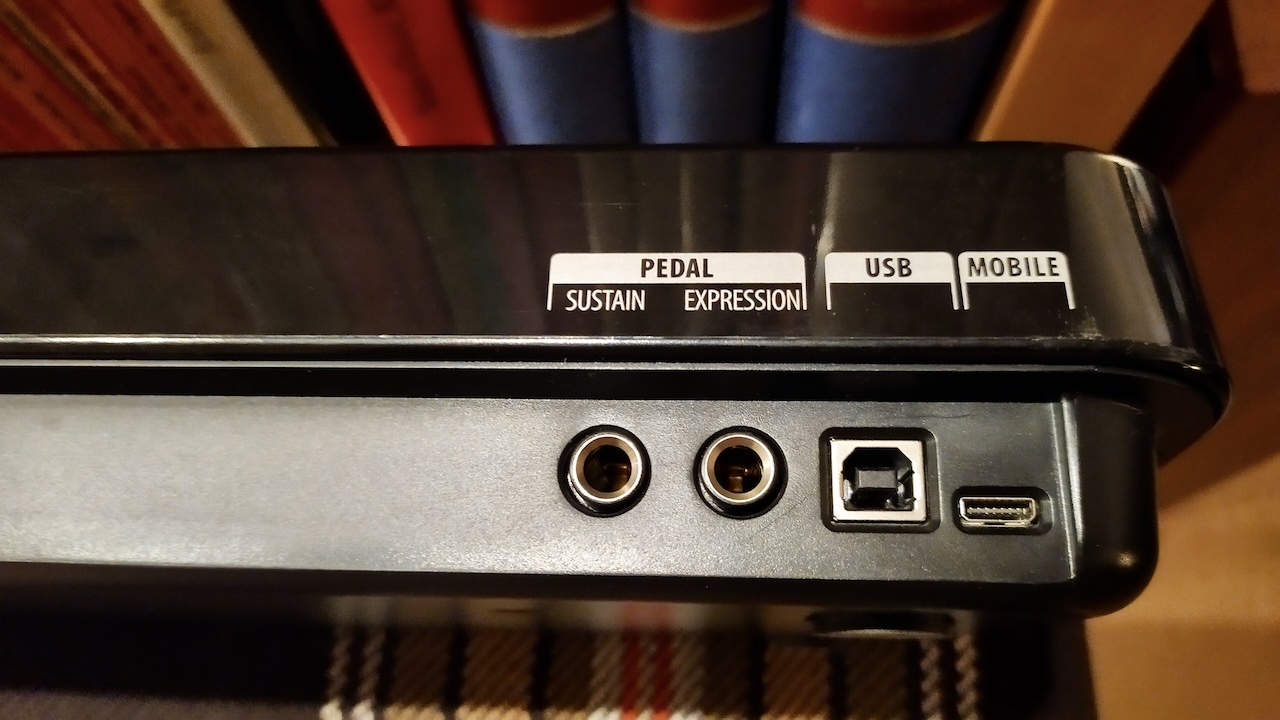 A special feature of this keyboard is that it has two connections for pedals (sustain and expression). This is quite rare. A computer can be connected via “USB” and a phone or tablet via “Mobile”.