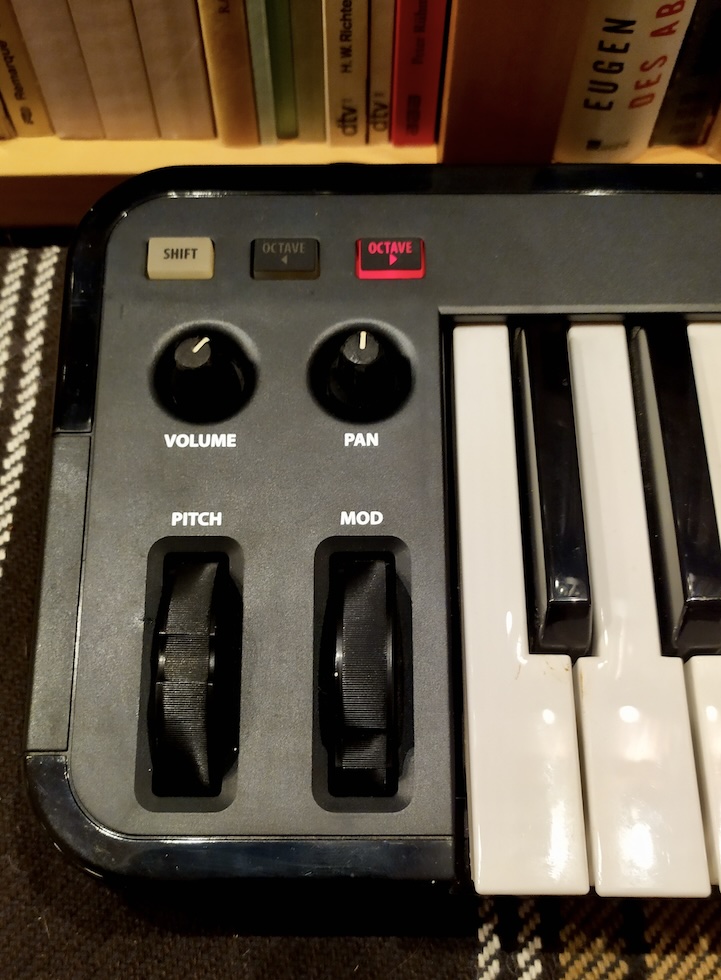 In addition to the pitch wheel and modulation wheel, the keyboard also has two additional controllers (knobs): (Volume and Pan / cc7 and cc10). There is also an Octave switch (when Shift is pressed, it is a transposition switch).